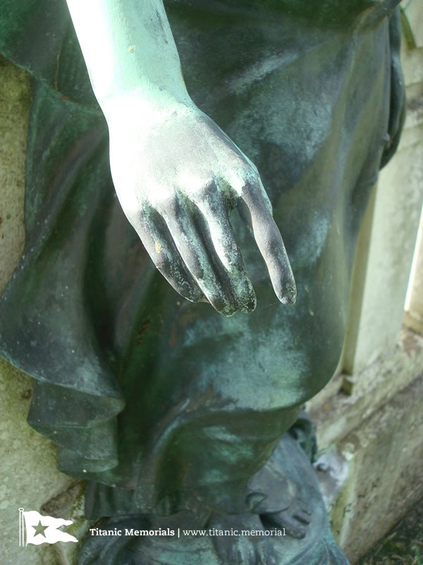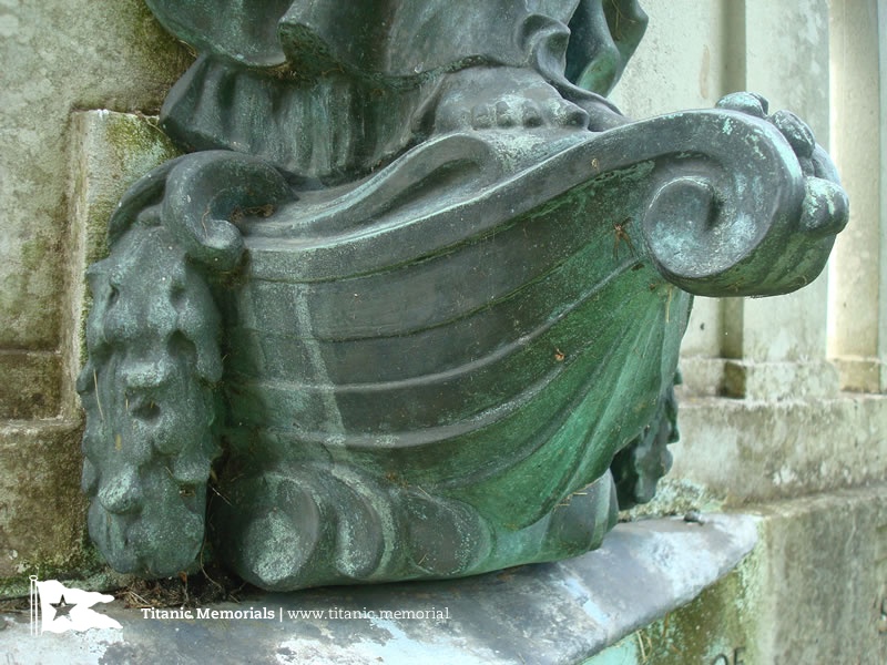 The grave mirrors the memorial's central figure of Glory, standing on the prow of a ship, and incorporates other element's of the memorial's design. Glory has her right arm outstretched by her side. Behind is set a plain semi-circular pediment; unlike the memorial in Southampton where the pediment carries two bas-relief brass panels showing engineers at work. The grave's pediment is set between a pair of twin columns, supporting the ends of the pediment. The figure of Glory and ship's prow stand on a plinth, projecting from a semi-circular exedra. The plinth of the grave carries the following inscription: