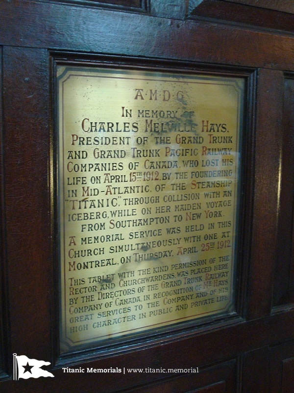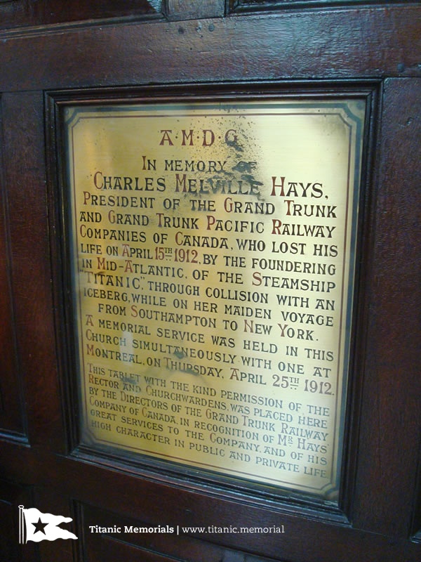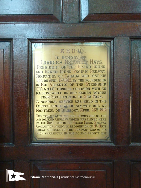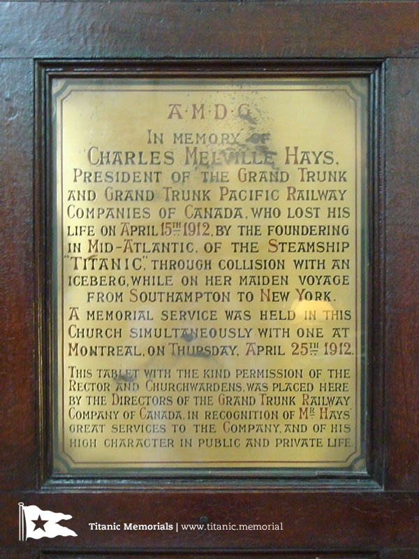 In memory of Charles Melville Hays. President of the Grand Trunk and Grand Trunk Pacific Railway Companies of Canada, who lost his life on April 15th 1912, by the foundering in mid-Atlantic, of the steamship "Titanic" through collision with an iceberg, while on her maiden voyage from Southampton to New York. A memorial service was held in this Church simultaneously with one at Montreal, on Thursday, April 25th 1912.