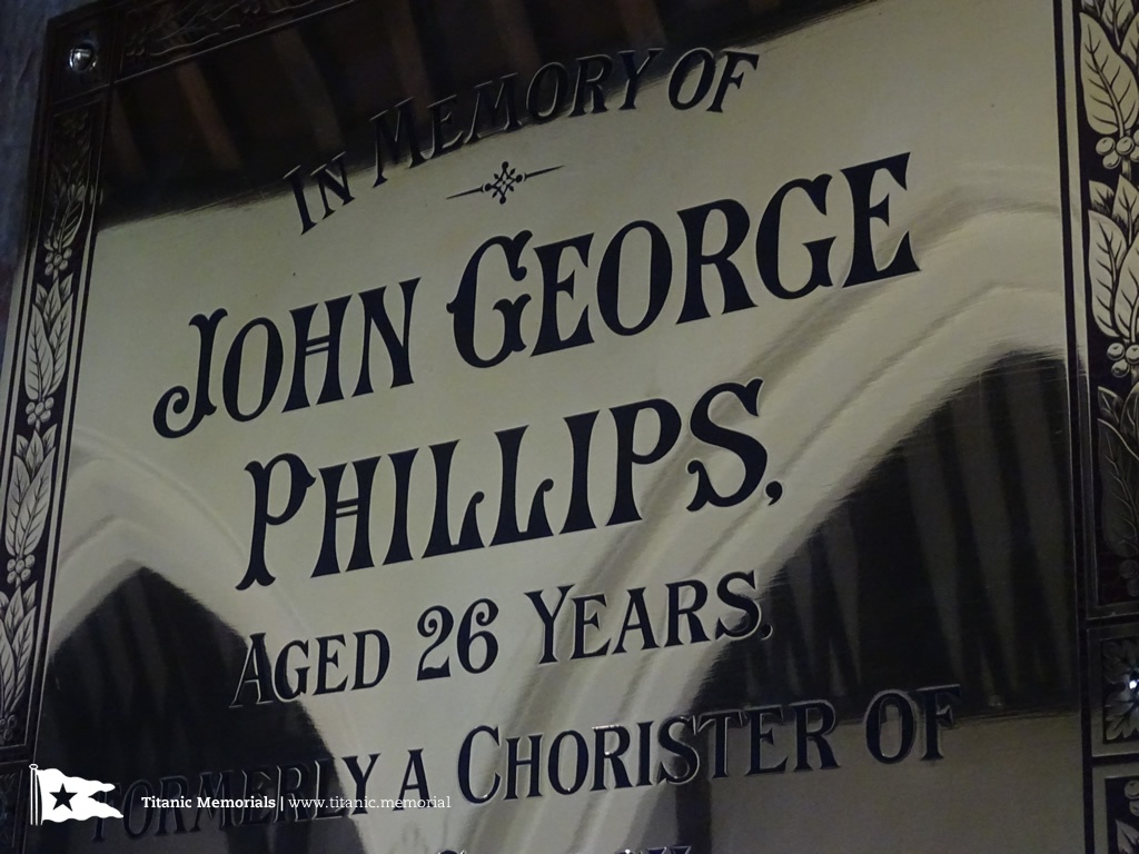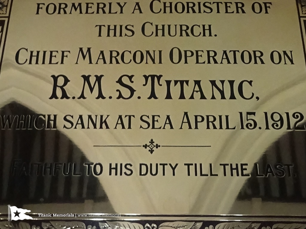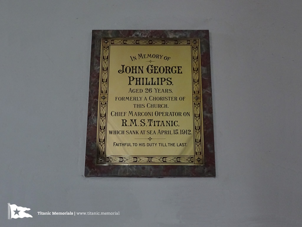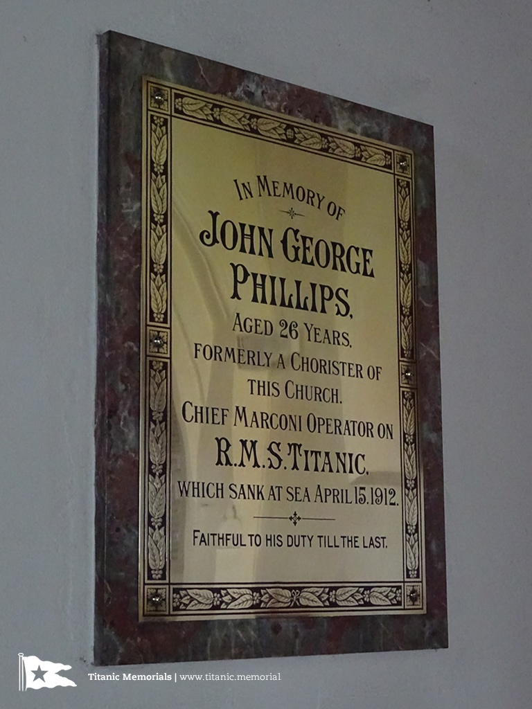 In Memory of John George Phillips. Aged 26 Years. Formerly a Chorister of this Church. Chief Marconi Operator on R.M.S. Titanic. Which sank at sea April 15. 1912. Faithful to his duty till the last.