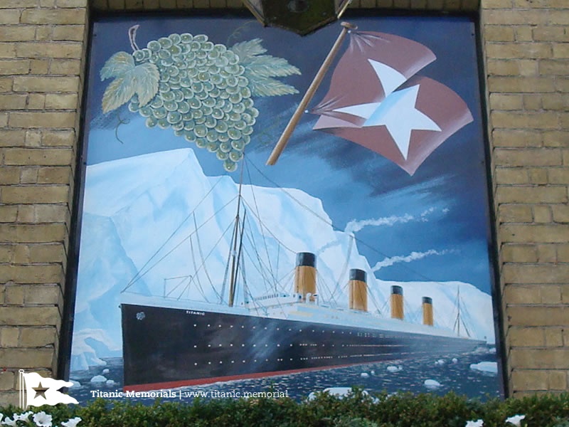 The windows to the central bay on all storeys are bricked up, with the first floor window blank carrying a painted mural of the White Star Line Titanic at night, in front of an over-sized iceberg. Above are a bunch of grapes and the White Star Line house flag, a red burgee flag with a white star.