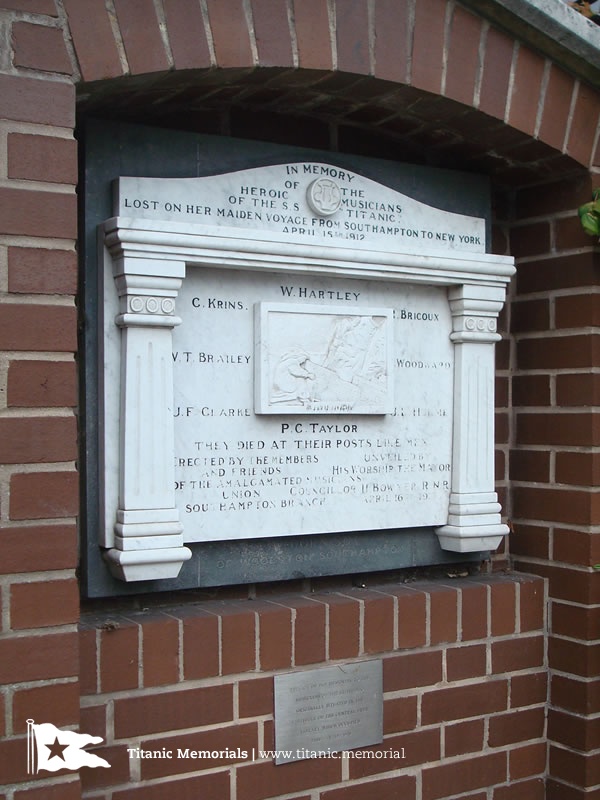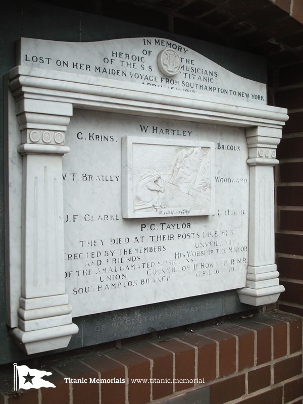 The central section of the tablet between the pilasters carries a central plaque with relief carving showing a female figure representing grief besides the Titanic sinking. The lower edge of the plaque is inscribed with musical notes of four bars of the hymn 'Nearer my God to Thee', widely reported as one of the hymns played by the musicians as the Titanic neared her end. The names of the musicians are listed around the plaque in the following order: W. Hartley, C. Krins, R. Bricoux, W. T. Brailey, J. Woodward, J. F. Clarke, J. L. Hulme, P. C. Taylor. Beneath, the tablet has the following additional inscriptions:
